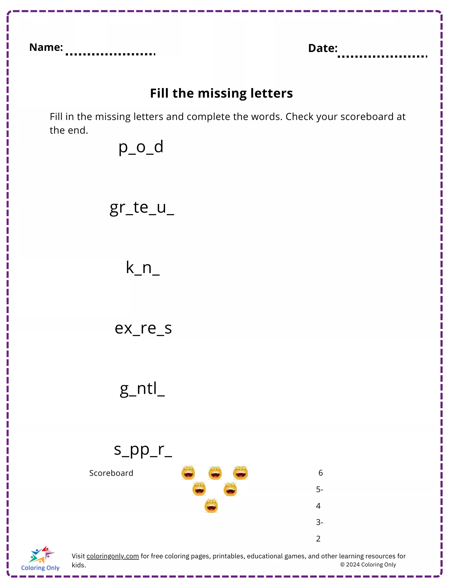 Coloring description : Download Printable Fill the missing letters free Printable Worksheet Coloring Page