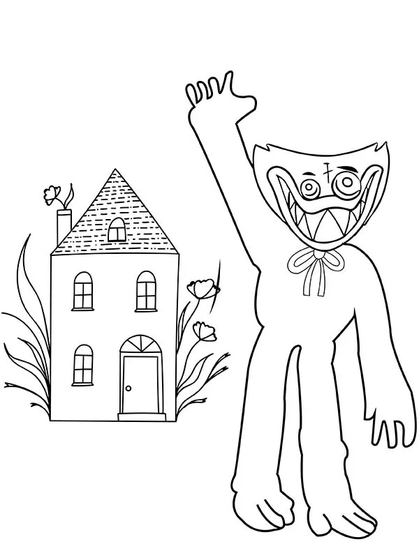 : Download Printable Huggy Wuggy acenando e casa Coloring Page