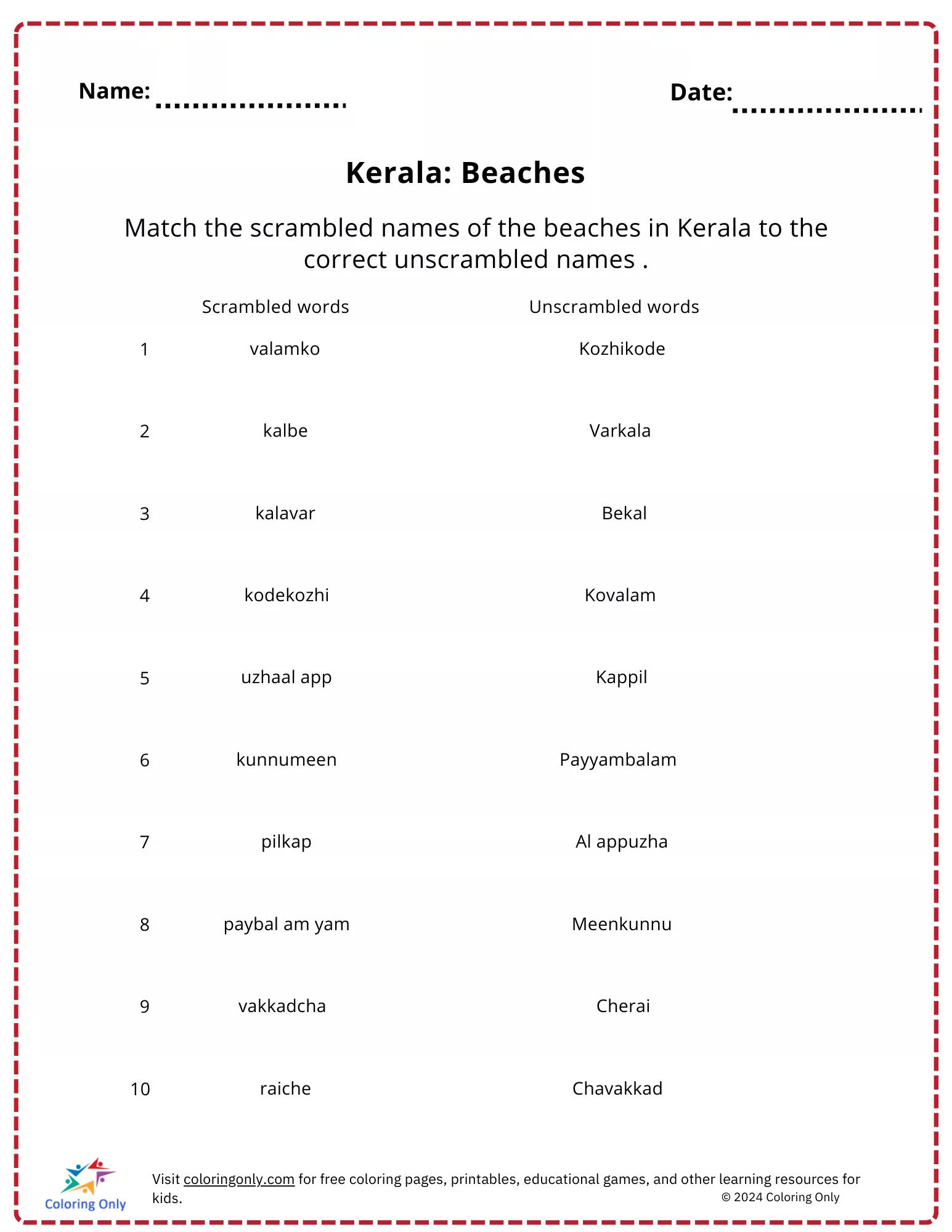 : Download Printable Kerala: Beaches free Printable Worksheet Coloring Page