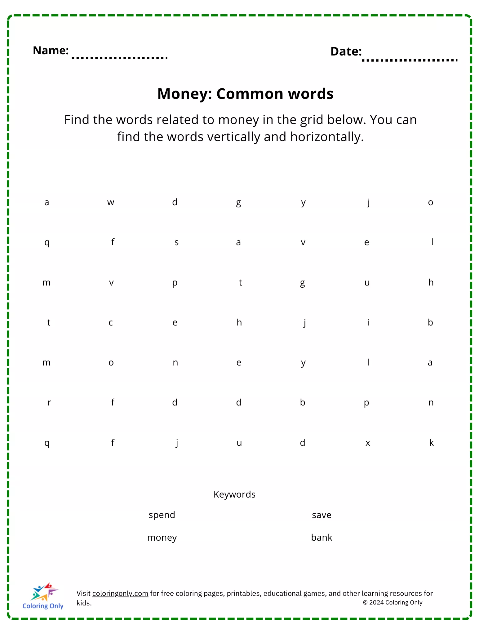 : Download Printable Money: Common words free Printable Worksheet Coloring Page