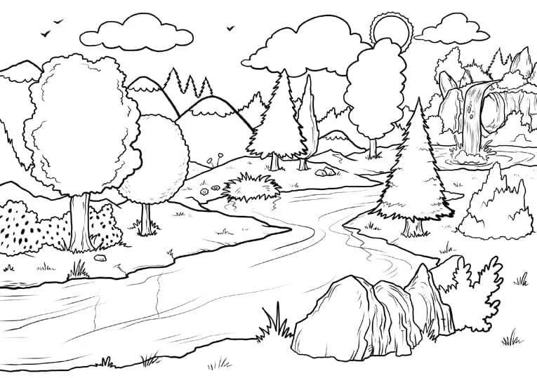 : Download Printable Cachoeira da cena da floresta Coloring Page