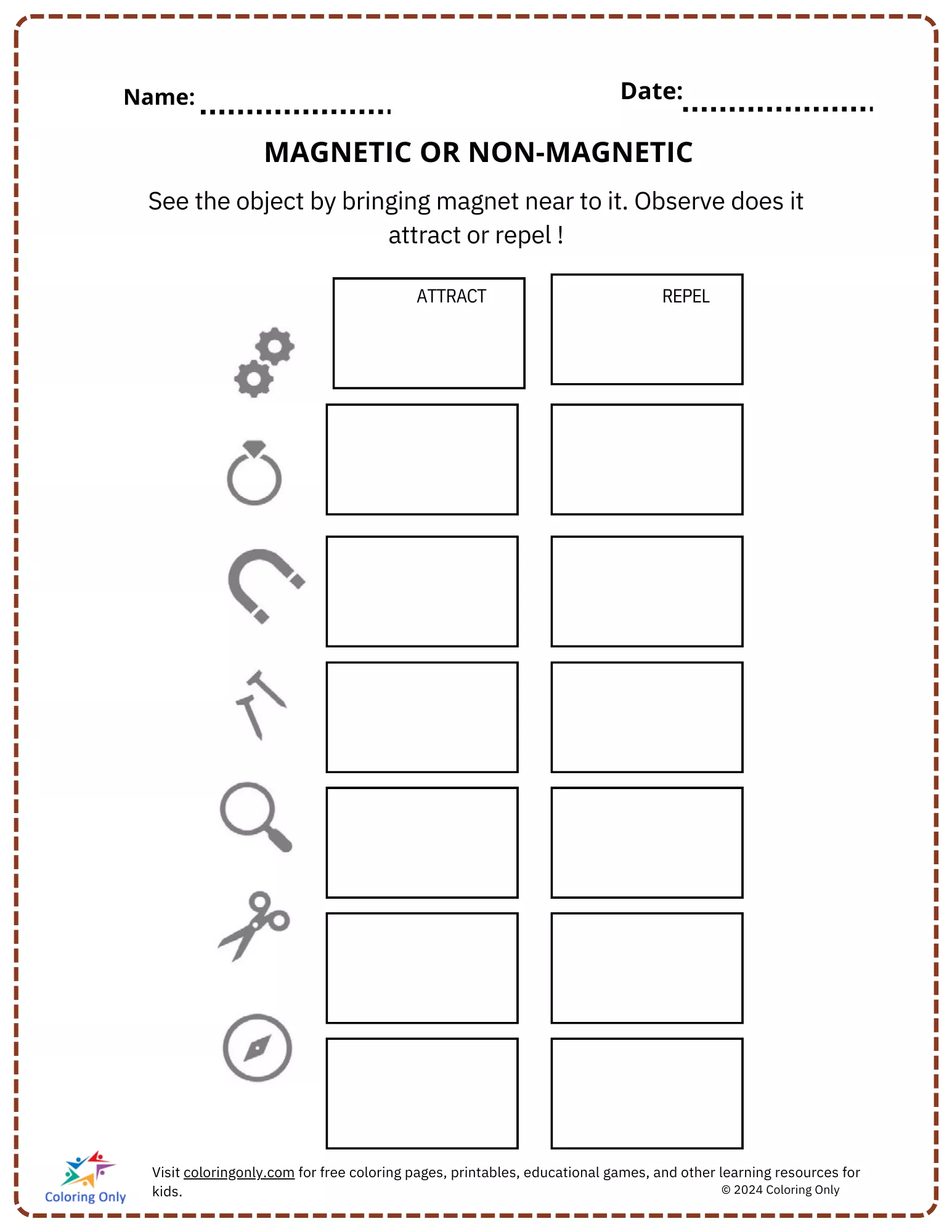 Os alunos aproximarão um ímã dos itens representados na planilha e observarão se os objetos se atraem ou se repelem.