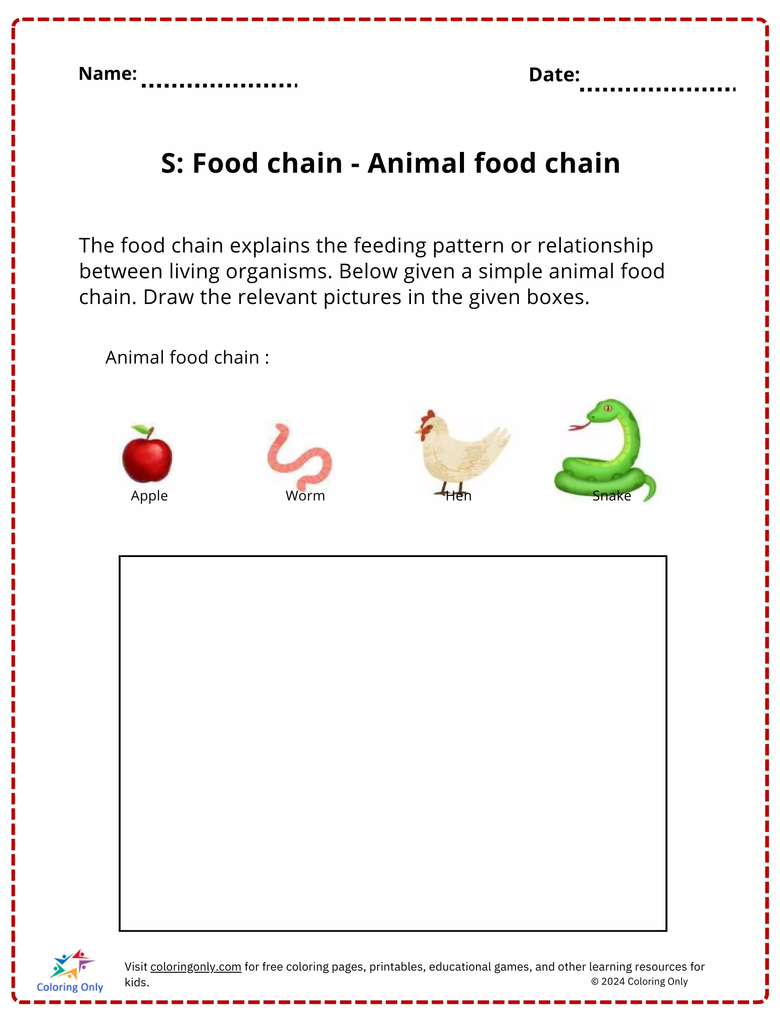 Esta planilha para impressão gratuita da cadeia alimentar animal S: Food Chain - Animal Food Chain é uma atividade envolvente projetada para aprimorar o aprendizado sobre o fluxo de energia através dos ecossistemas.