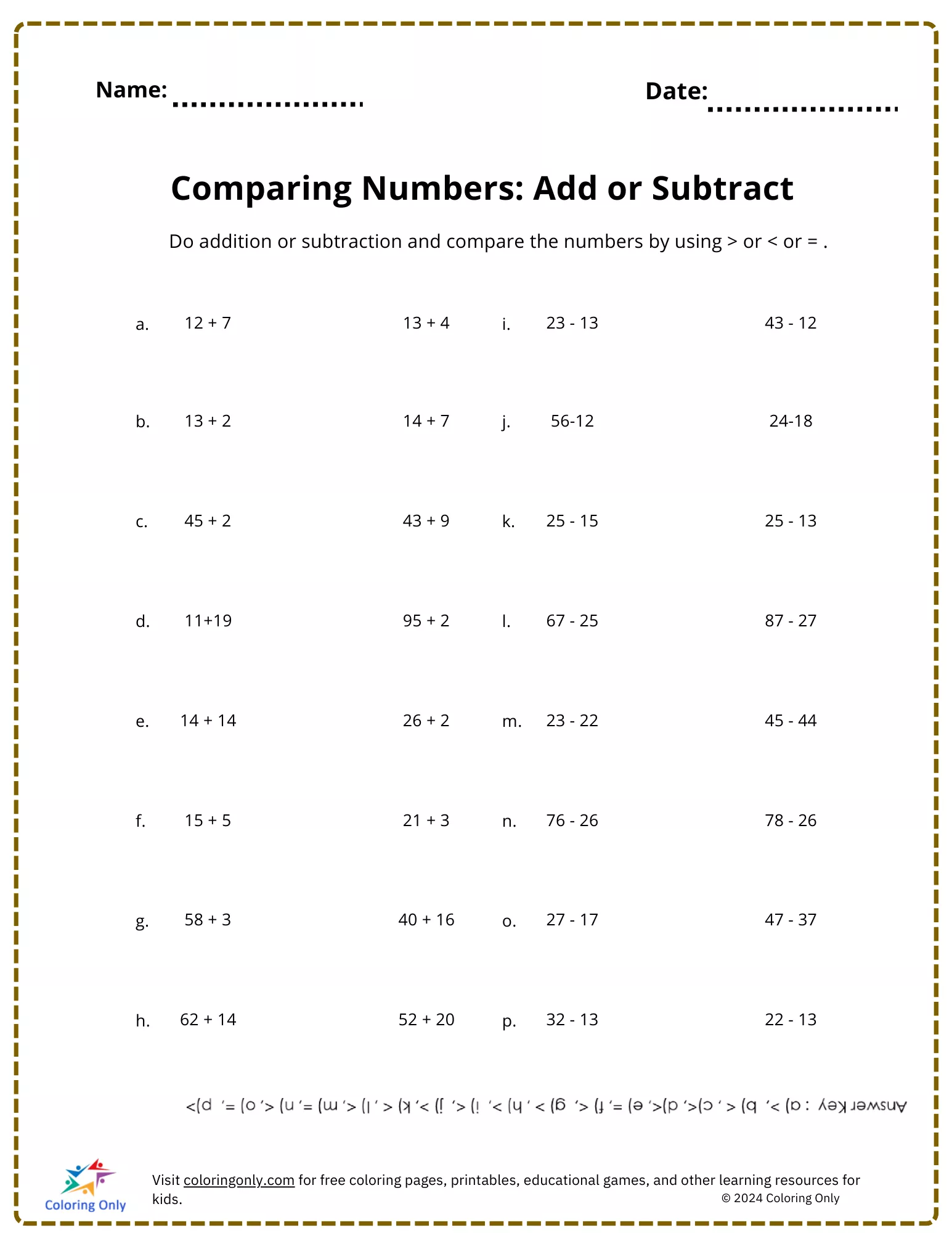 A planilha para impressão gratuita de comparação de números: adicione ou subtraia é uma ferramenta valiosa para os alunos do ensino fundamental aprimorarem suas habilidades aritméticas.