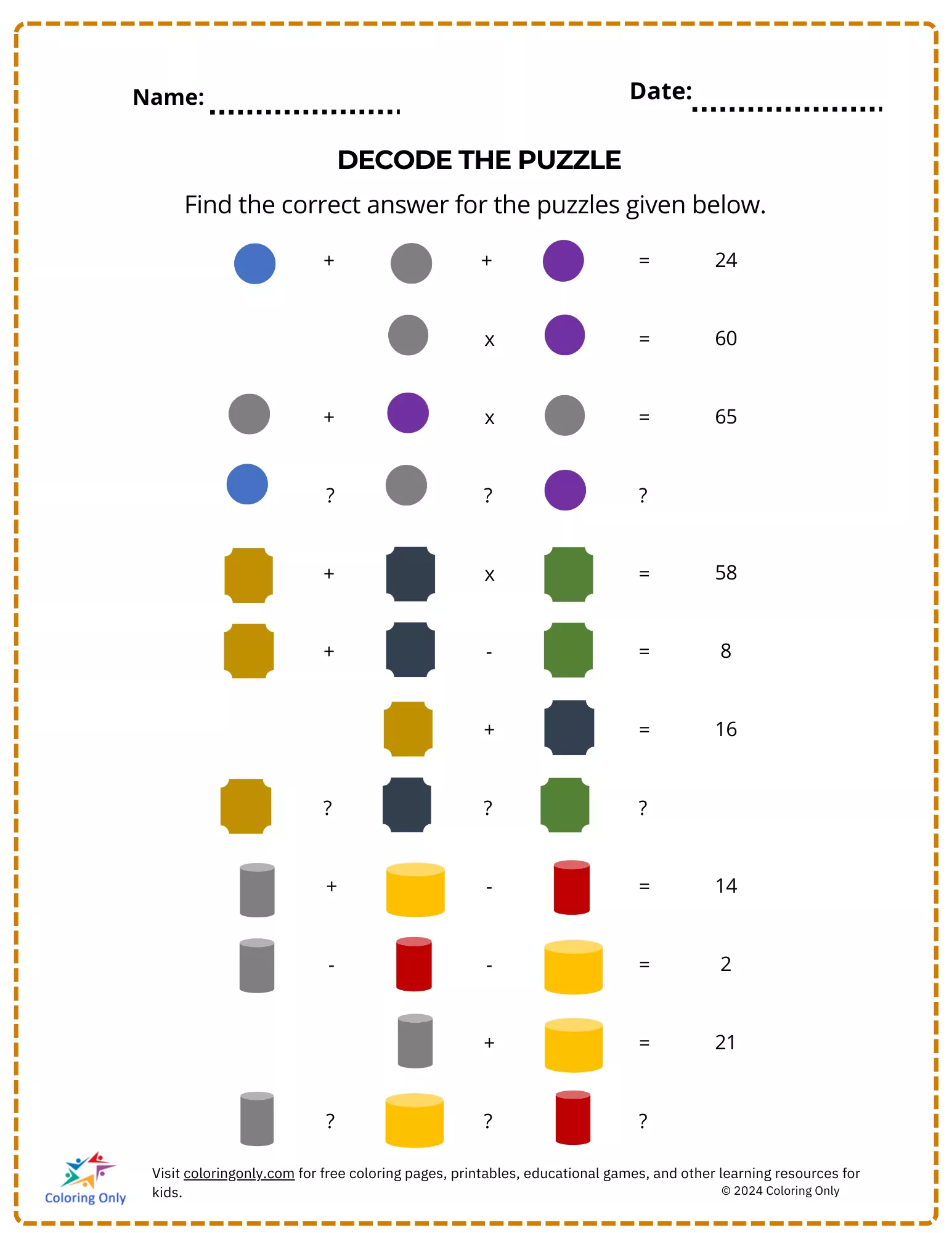 Esta planilha ajuda as crianças a praticar o raciocínio matemático decodificando e resolvendo quebra-cabeças coloridos baseados em símbolos.