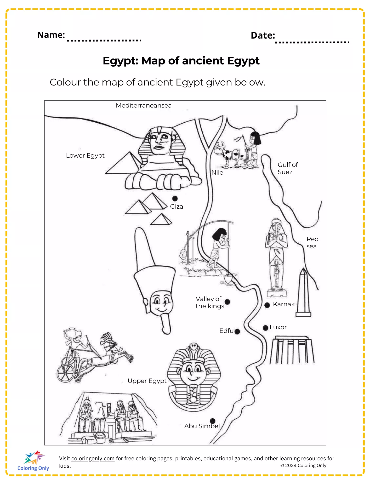 A planilha para impressão gratuita do Egito: Mapa do Egito Antigo incentiva os alunos a se envolverem com a história de maneira visual e criativa, tornando o aprendizado divertido e interativo.