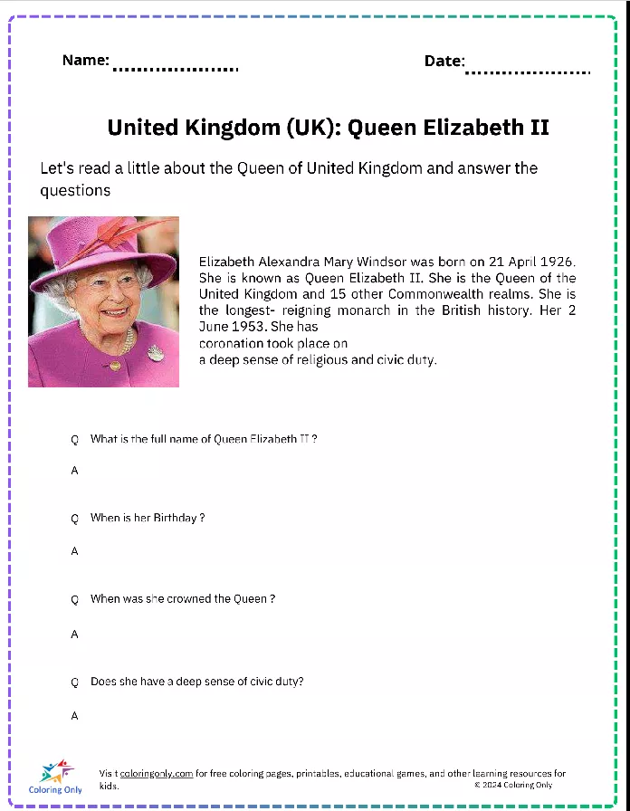 O "Reino Unido (Reino Unido): Planilha para impressão gratuita da Rainha Elizabeth II" serve como uma ferramenta envolvente para ensinar história e a monarquia britânica.