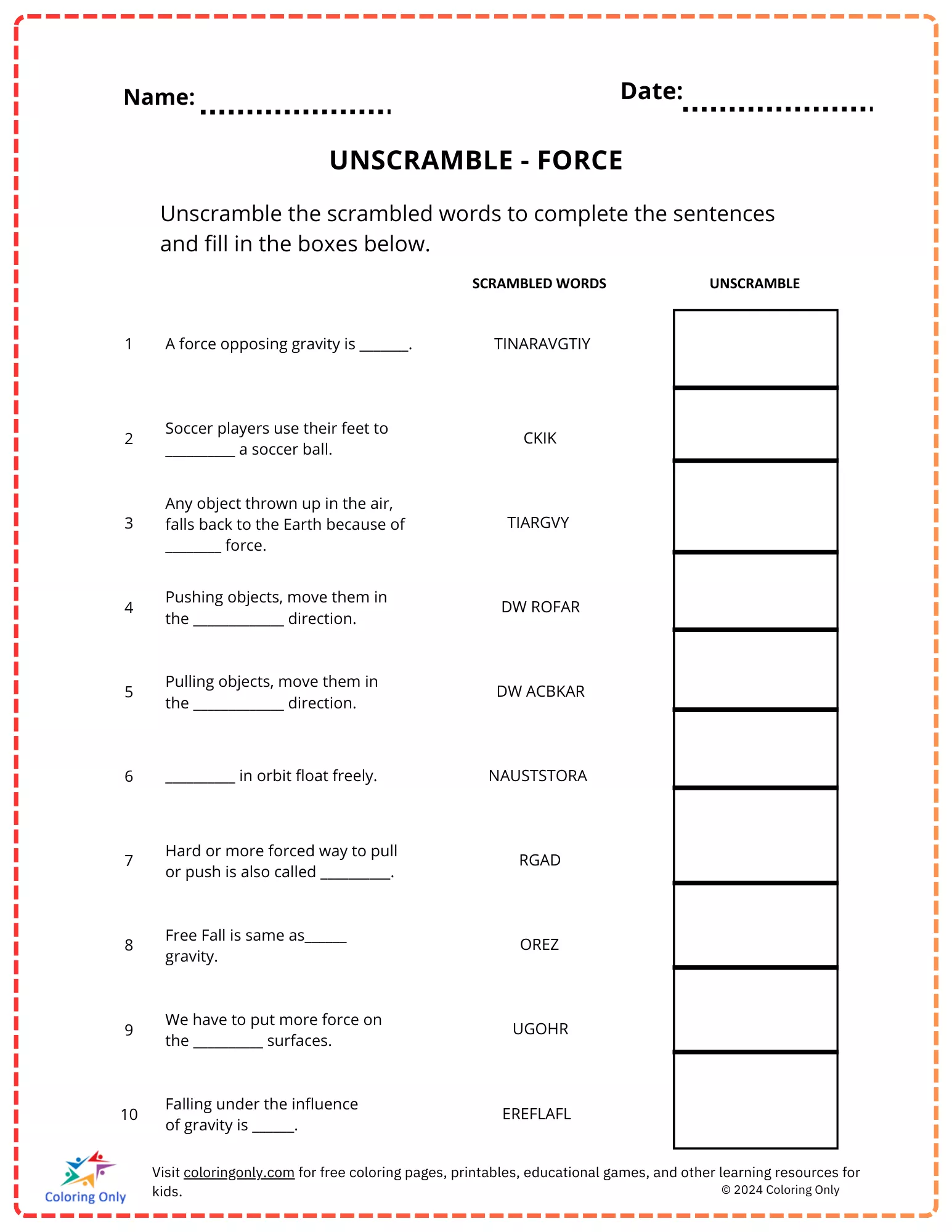 A "UNSCRAMBLE - FORCE Free Printable Worksheet" é perfeita para reforçar conceitos-chave de uma forma divertida e interativa, tornando-a um complemento ideal para qualquer sala de aula ou ambiente de aprendizagem em casa.