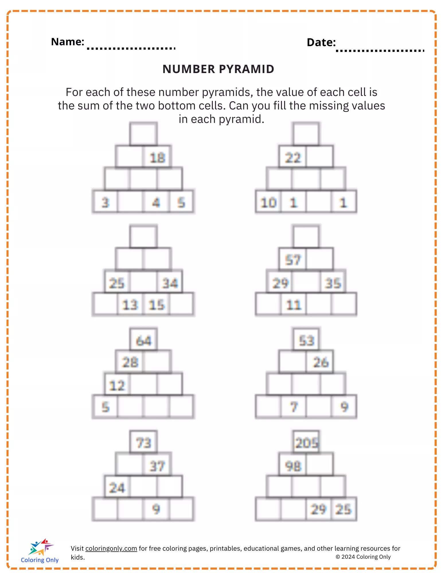 A planilha para impressão gratuita PIRÂMIDE DE NÚMEROS é uma atividade matemática envolvente projetada para alunos do ensino fundamental. Esta planilha ajuda as crianças a praticar a adição preenchendo os números que faltam em várias pirâmides numéricas. O valor de cada célula é a soma das duas células diretamente abaixo dela. A atividade aprimora as habilidades de adição, raciocínio lógico e habilidades de resolução de problemas de uma forma divertida e interativa. Esta planilha é perfeita para atividades em sala de aula, lição de casa ou prática extra em casa, permitindo que os jovens alunos fortaleçam sua compreensão dos conceitos básicos de matemática.