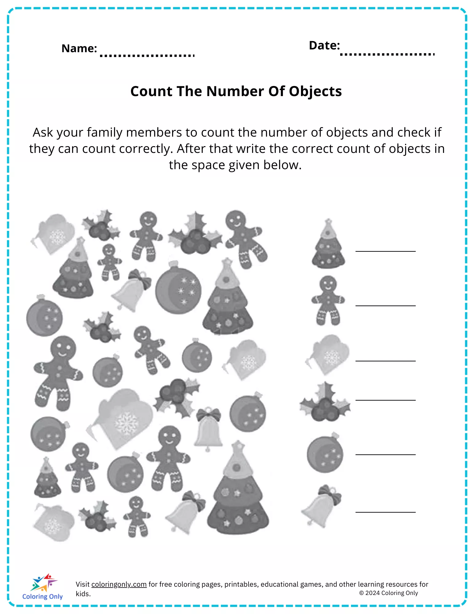 Esta planilha incentiva as crianças a contar vários objetos, como itens com tema natalino, e escrever o número correto no espaço designado.