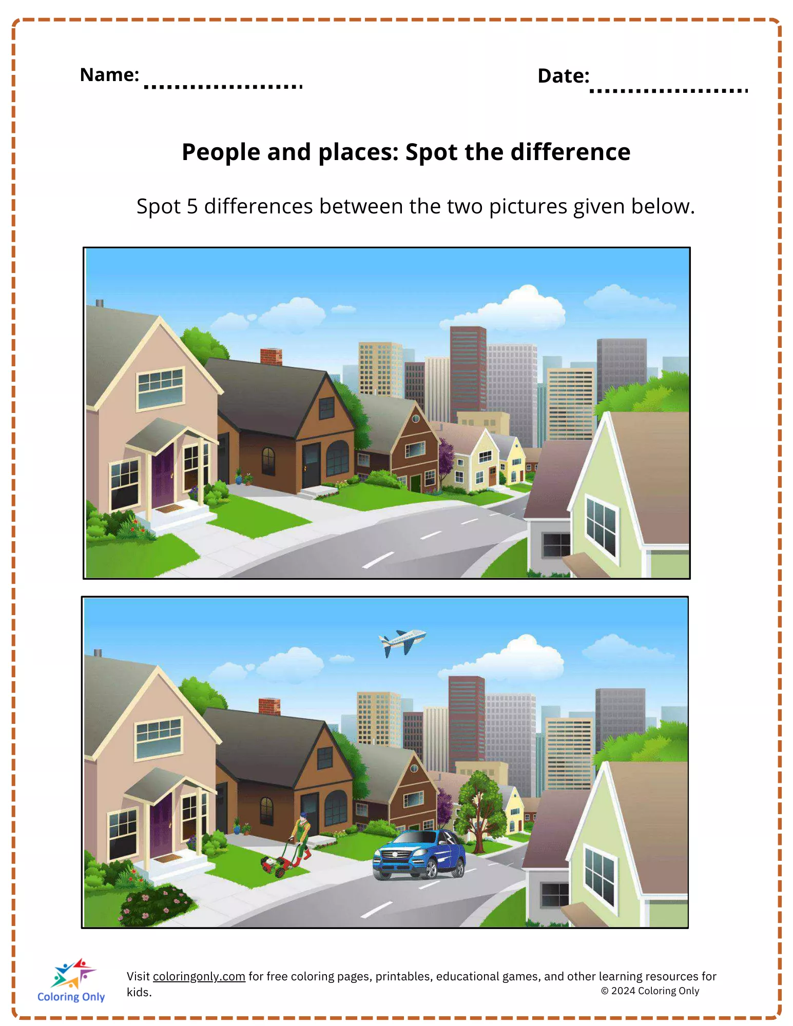 Esta planilha apresenta duas imagens vibrantes de uma cena de bairro onde as crianças têm a tarefa de encontrar 5 diferenças sutis entre as imagens.