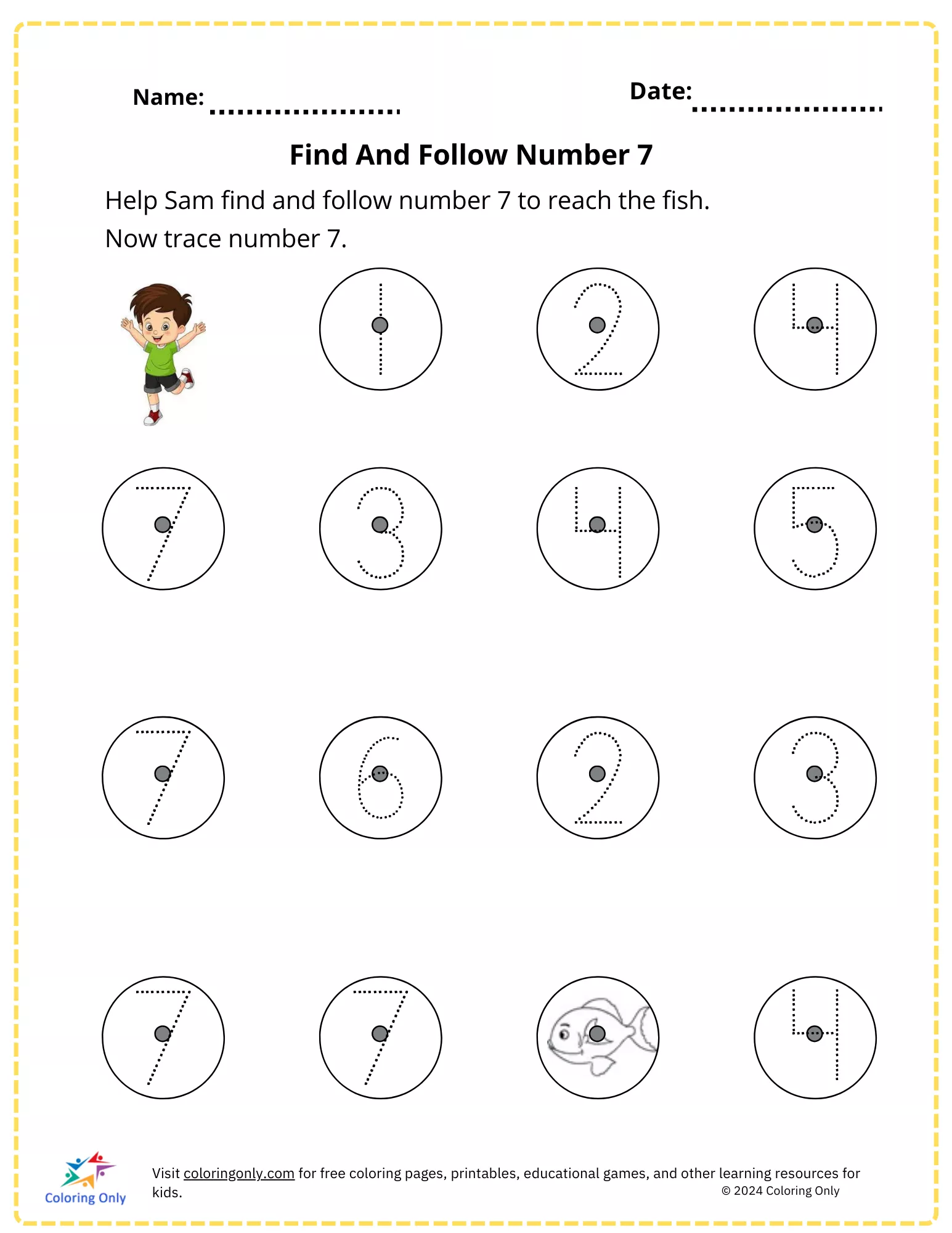 Nesta planilha, as crianças são solicitadas a encontrar e rastrear todos os números 7 para ajudar Sam a alcançar o peixe.