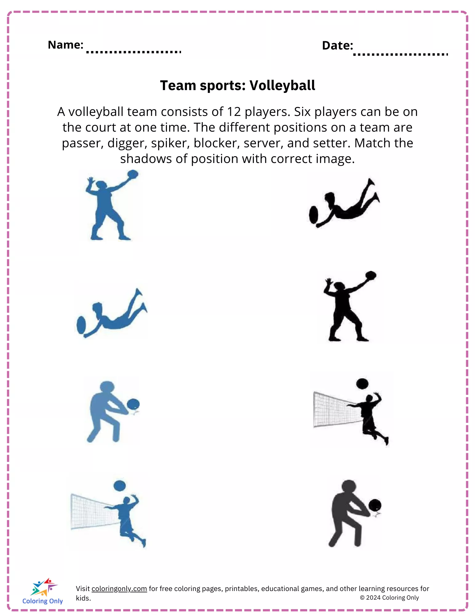 Esta atividade ensina as crianças sobre as seis posições principais em um time de vôlei, incluindo passador, atacante, sacador, levantador, bloqueador e escavador.
