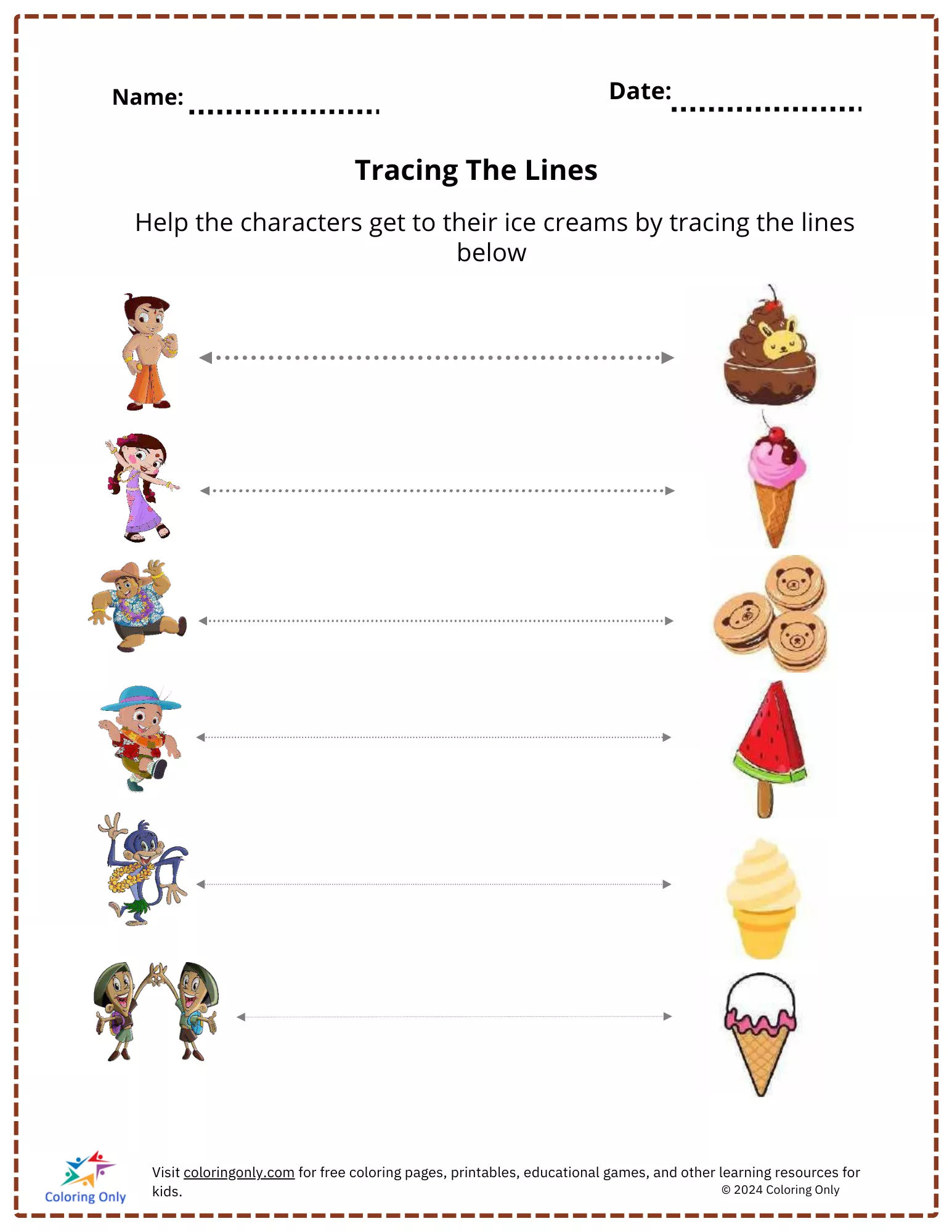 Esta atividade envolvente ajuda as crianças a desenvolver habilidades motoras finas e coordenação olho-mão, guiando os personagens para seus deliciosos sorvetes.