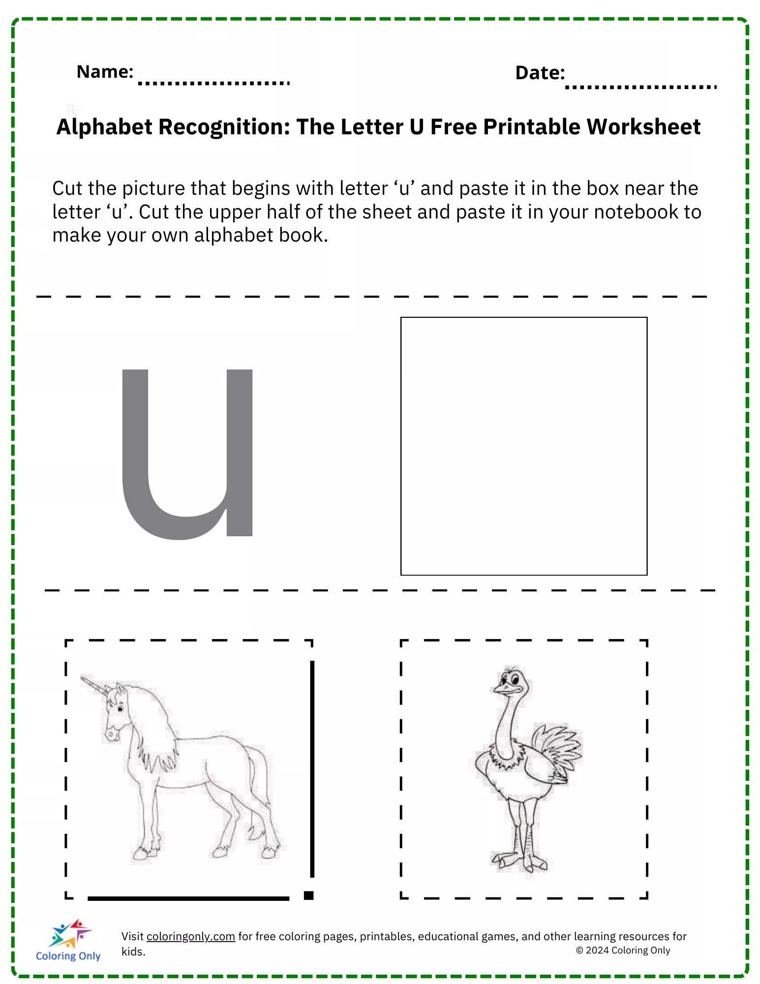Esta planilha incentiva as crianças a recortar a imagem que começa com a letra 'U' e colá-la na caixa ao lado da letra para um aprendizado prático e divertido.