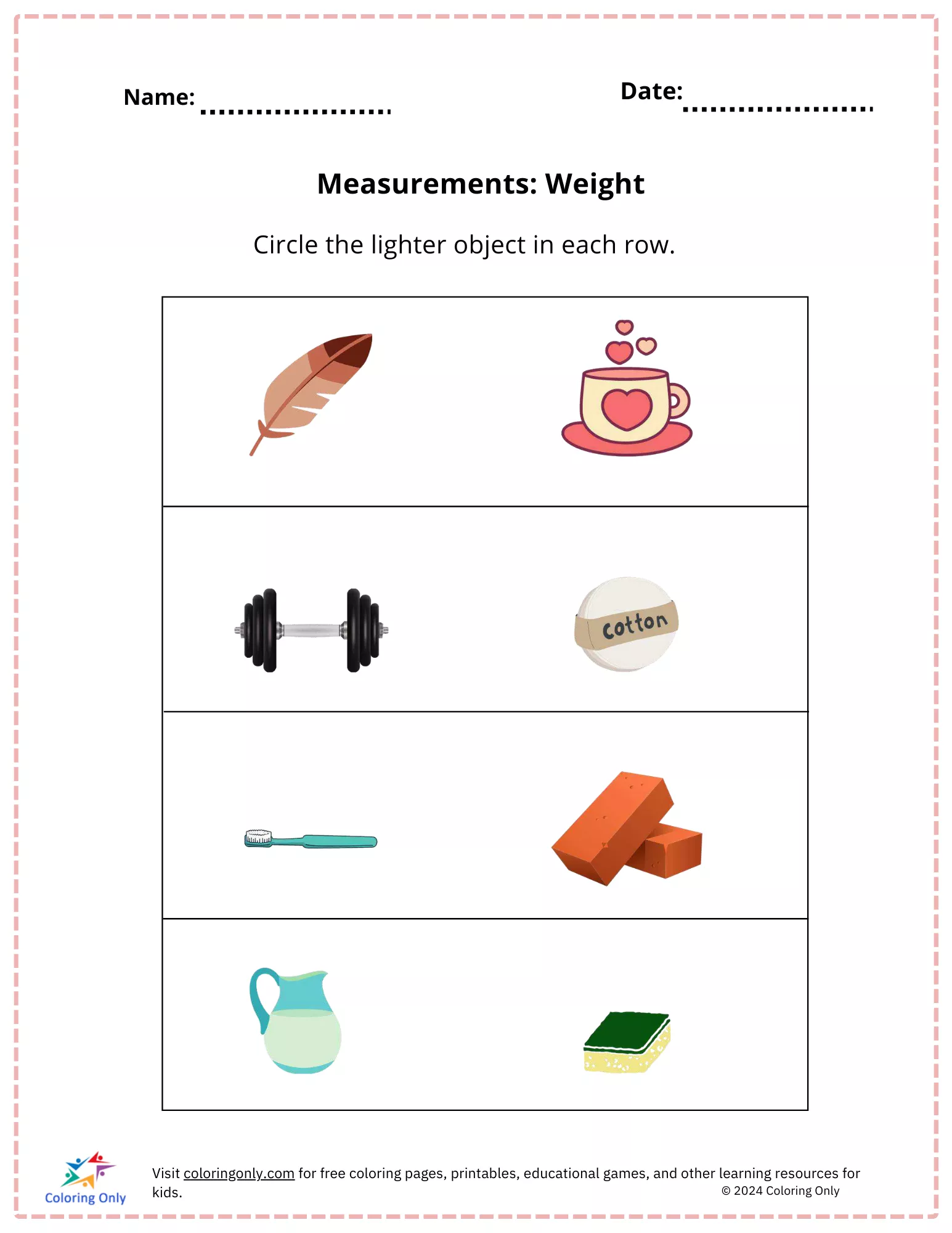 Esta planilha envolvente pede às crianças que circulem o objeto mais leve em cada linha, ajudando-as a desenvolver sua compreensão de diferentes pesos.