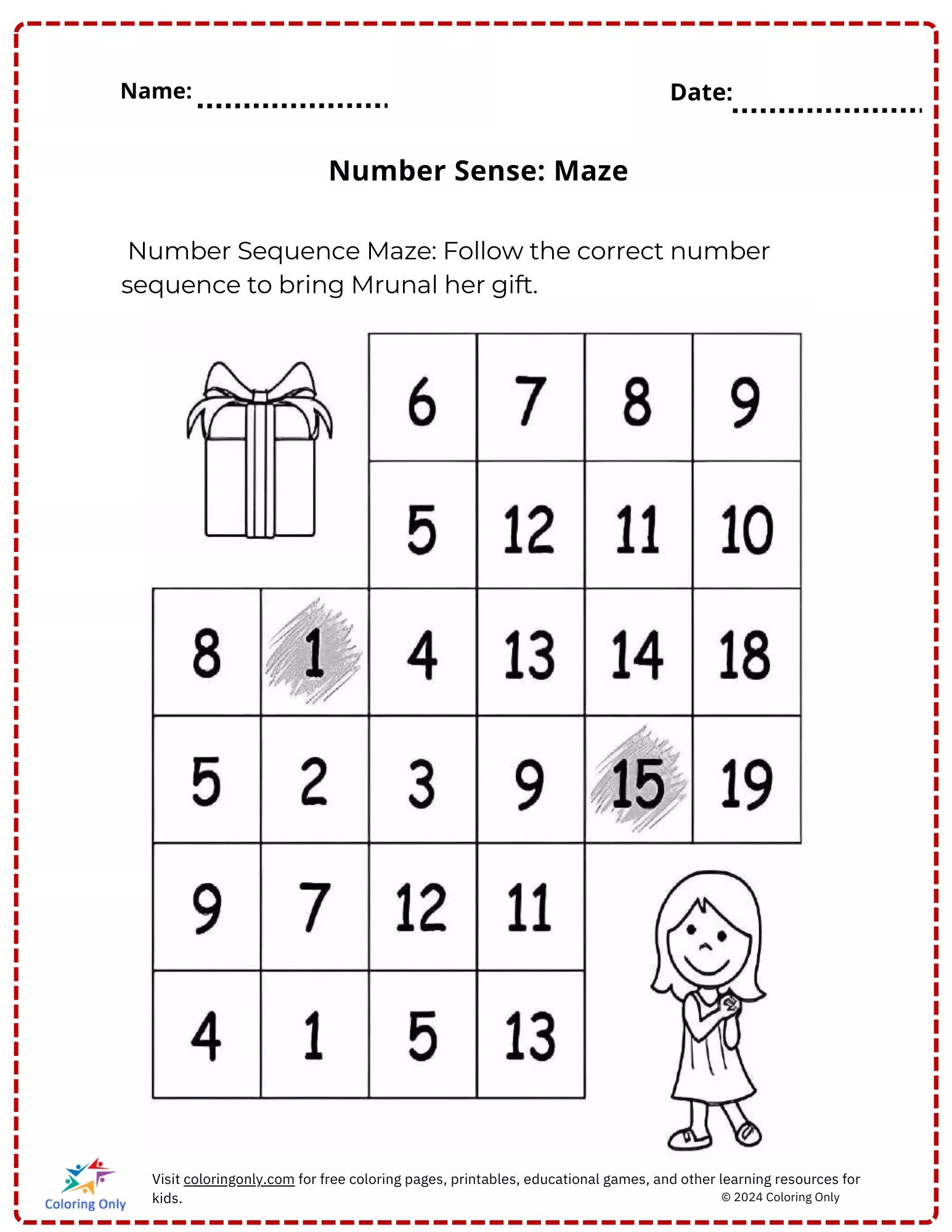 A planilha para impressão gratuita do Senso de Número: Labirinto é uma atividade emocionante e educacional para crianças em idade pré-escolar praticarem suas habilidades de sequenciamento de números. As crianças devem seguir a sequência numérica correta do início ao fim para ajudar a trazer seu presente para Mrunal, navegando pelo labirinto conectando os números na ordem certa. Esta divertida planilha aprimora as habilidades de contagem, reconhecimento de números e habilidades de resolução de problemas. A planilha para impressão gratuita Number Sense: Maze oferece uma maneira lúdica e interativa para os jovens alunos se envolverem com conceitos matemáticos enquanto desfrutam do desafio de um labirinto.
