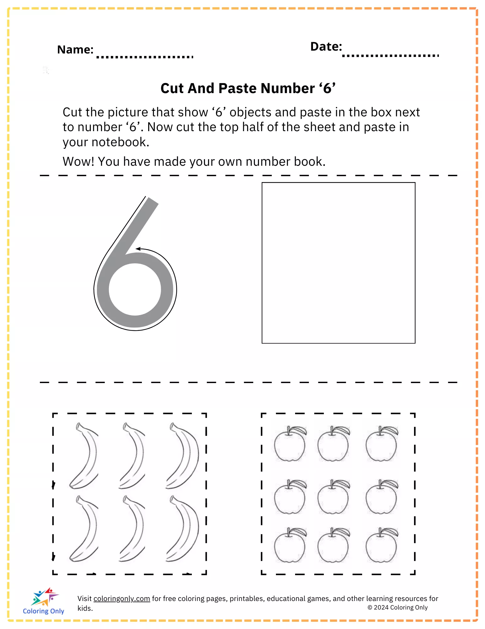 Esta planilha ajuda as crianças a praticar o reconhecimento e a contagem de números, fazendo com que recortem imagens que mostram seis objetos e colem-nas na caixa ao lado do número 6.