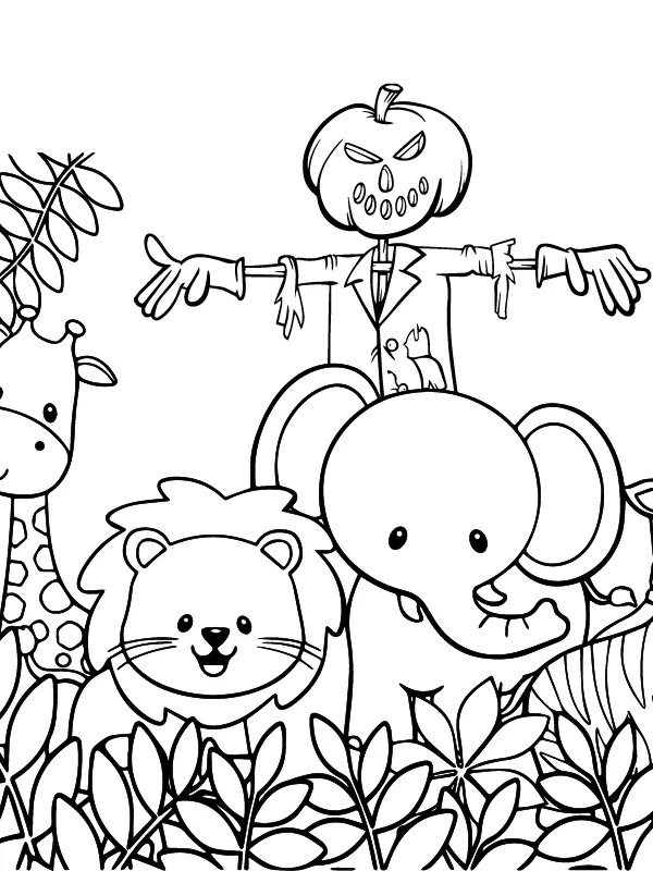 : Download Printable Espantalho de cabeça de abóbora com animais Coloring Page
