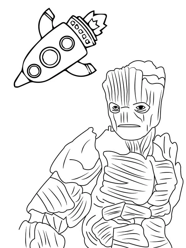 Coloring description : Download Printable Old Groot with a Cartoon Rocket Coloring Page